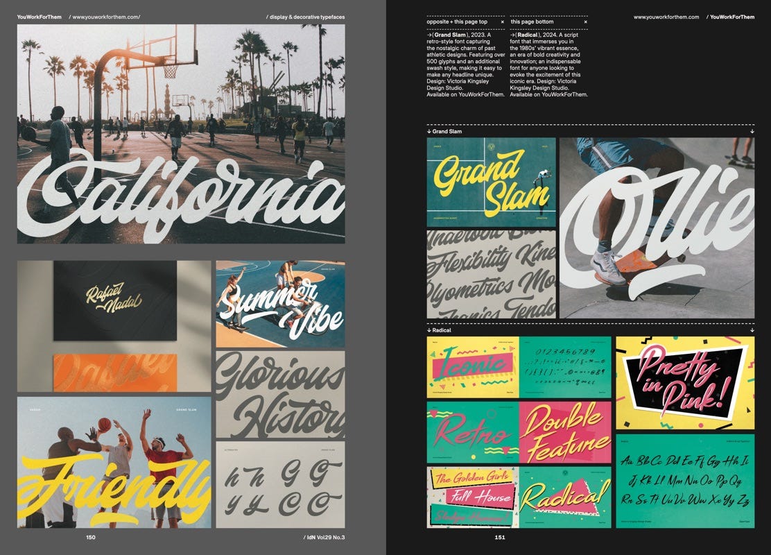 The company is maximalist in their layouts, sparing no space in their 150+ page issues, as they showcase not only from a variety of designers, but from a variety of designers with dense portfolios. Each issue hones in on a different topic, and these topics range from character design, restaurant graphics, logo and branding collateral, to typography, illustration, video game graphics, and more.